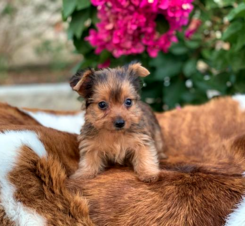 I love this little male. Eyes look like they have eyeliner around them! Such a handsome parti puppy. He is playful and would be great if you have kids. He will be a standard size yorkie and great if you love to walk or have children. He will even herd our goats. lol I think he is so handsome!!!